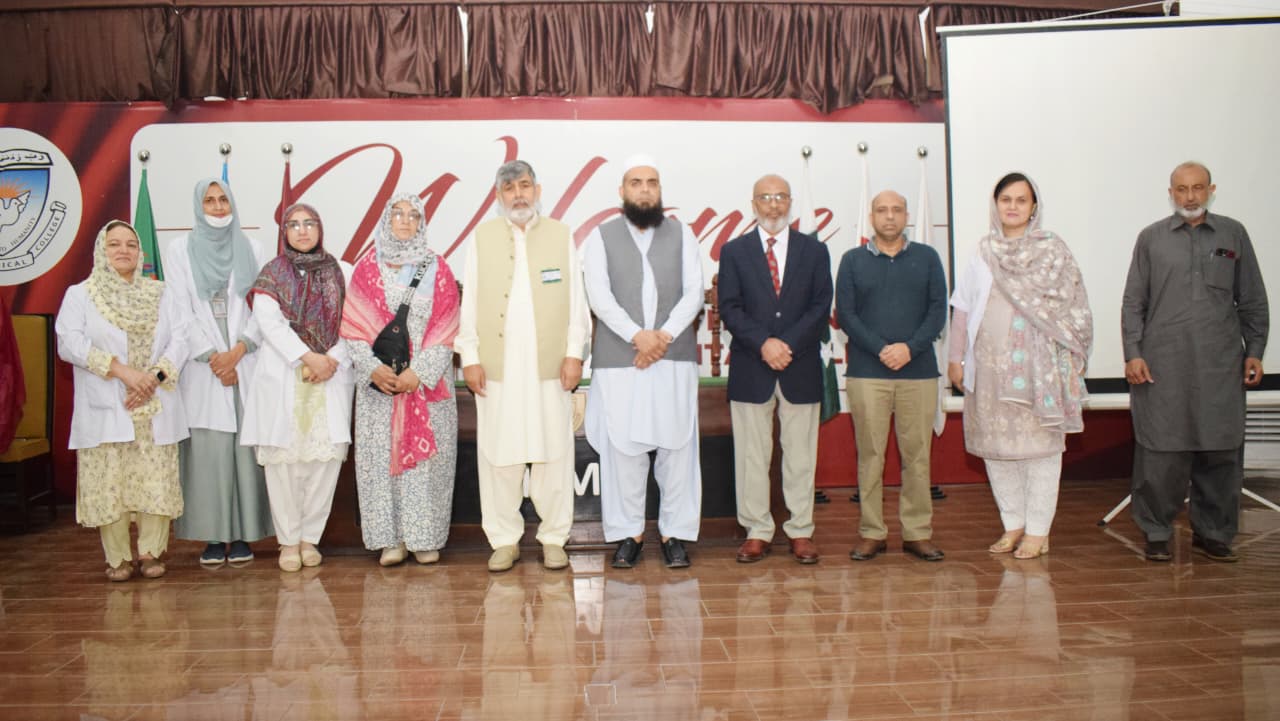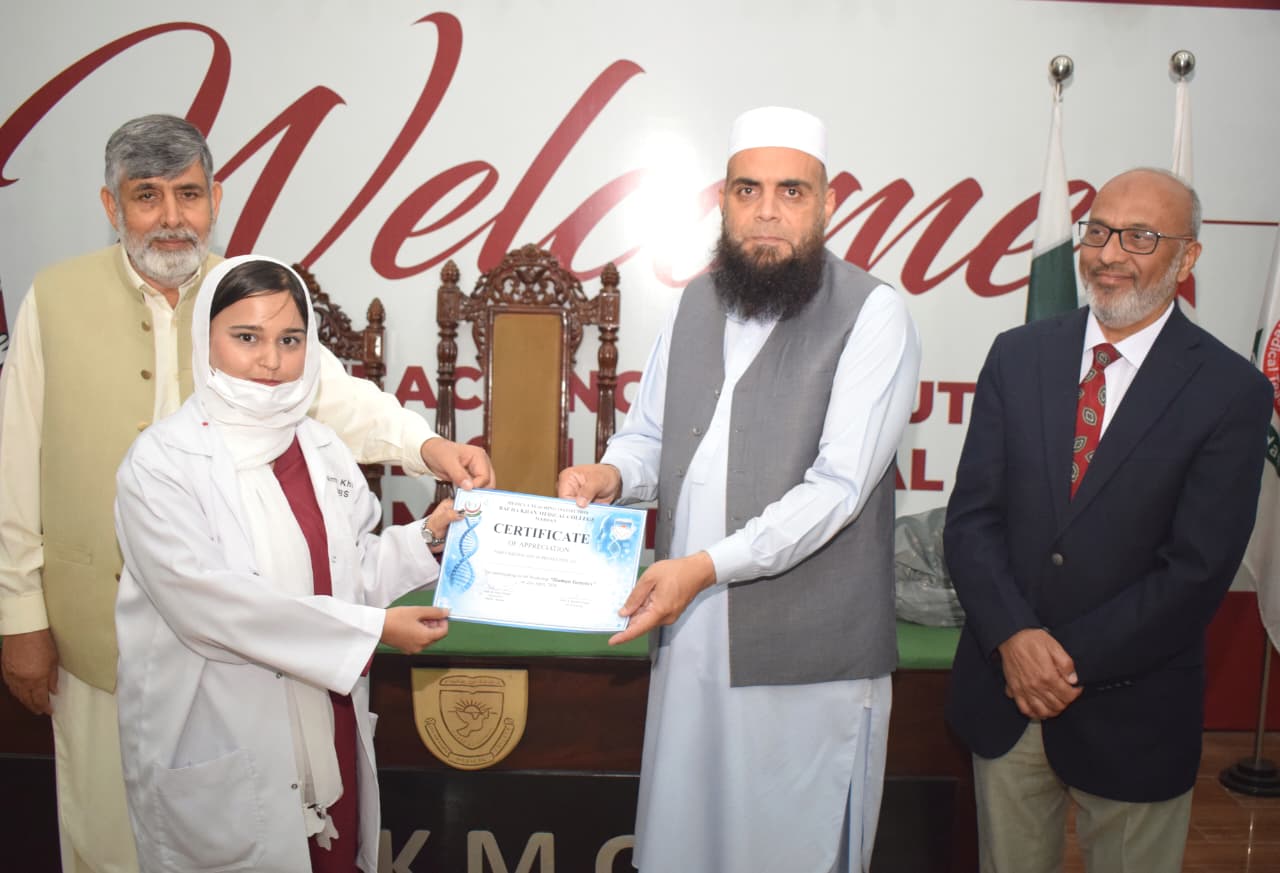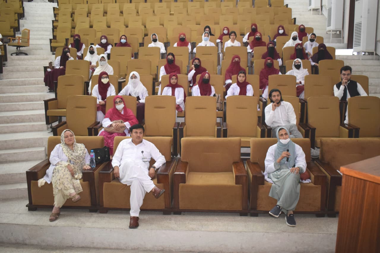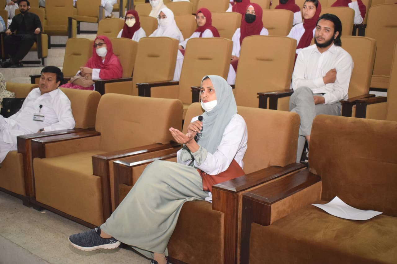 The event features a presentation by Dr. Asmat Shaheen from the Department of Biochemistry, with guest speaking contributions from Professor Dr. Musharraf Jelani and the CEO/Dean of BKMC, Dr. Jawad Ahmad.