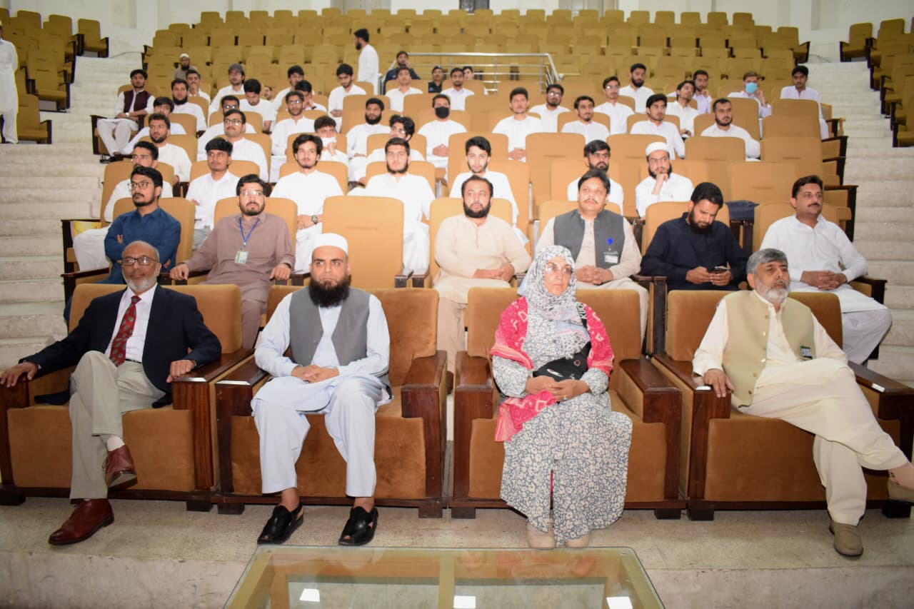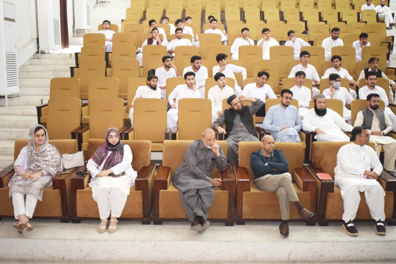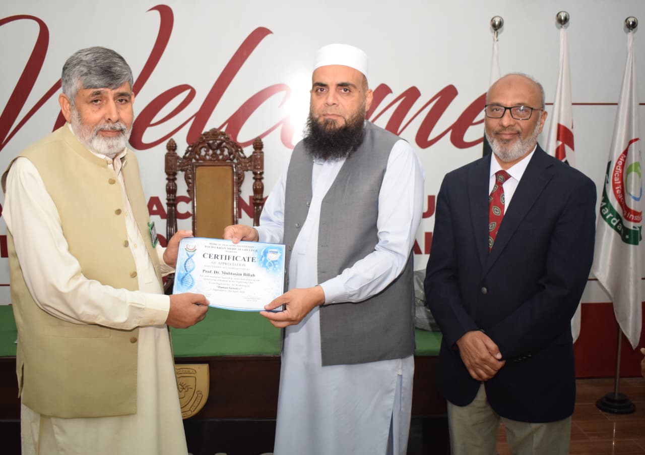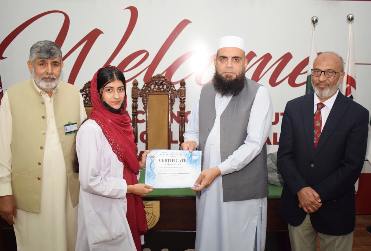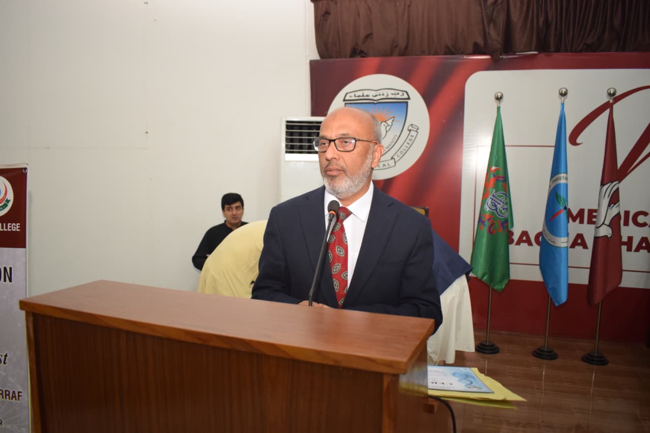 The event features a presentation by Dr. Asmat Shaheen from the Department of Biochemistry, with guest speaking contributions from Professor Dr. Musharraf Jelani and the CEO/Dean of BKMC, Dr. Jawad Ahmad.